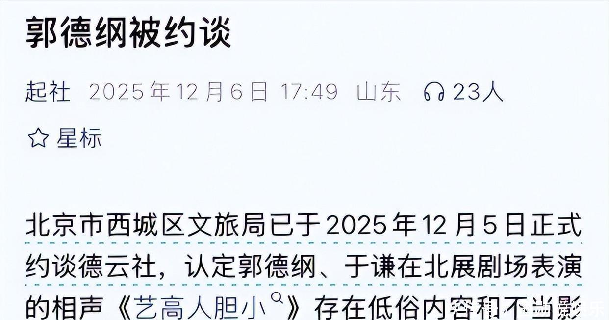 11月26号那天,德云社在北京展览馆有场演出,其中郭德纲和于谦搭档的《艺高人胆小》节目被人实名投诉说内容“太低俗”。举报信里写得明明白白,连演出的台词是啥、啥时候说的都写得一清二楚,让人没法反驳。比如开玩笑说黑粉是“偷东西的、在街边拉客的”,还用“风月场所”“全裸上阵”这类有点色情的词去描述吃的。